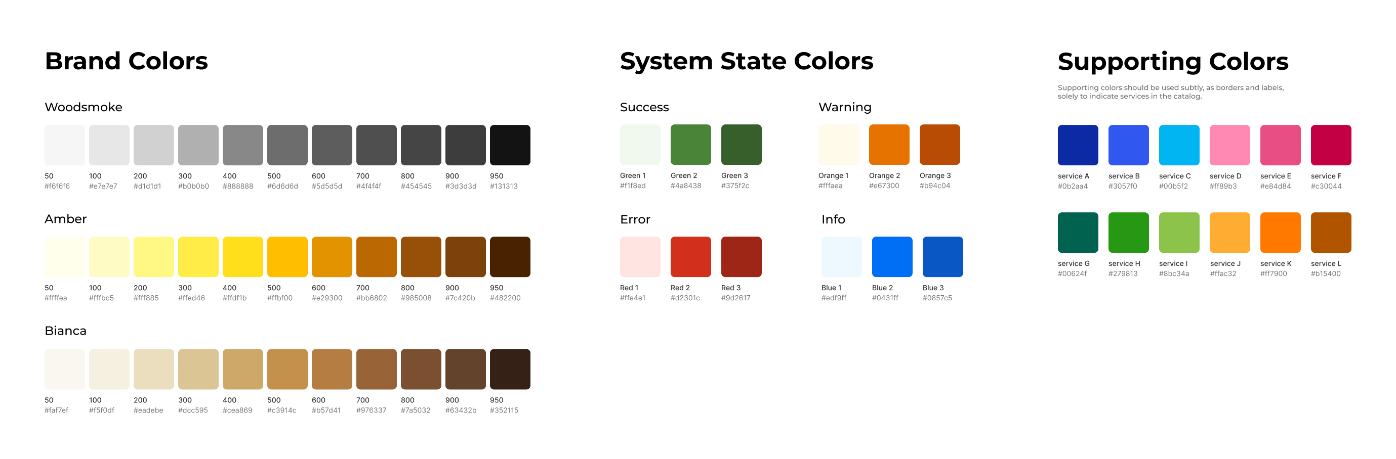The primary colors chosen are yellow (Amber) and black (Woodsmoke), complemented by a beige shade (Bianca). The color scheme for system messages has also been defined, along with complementary colors designated exclusively for use as service indicators in the catalog.