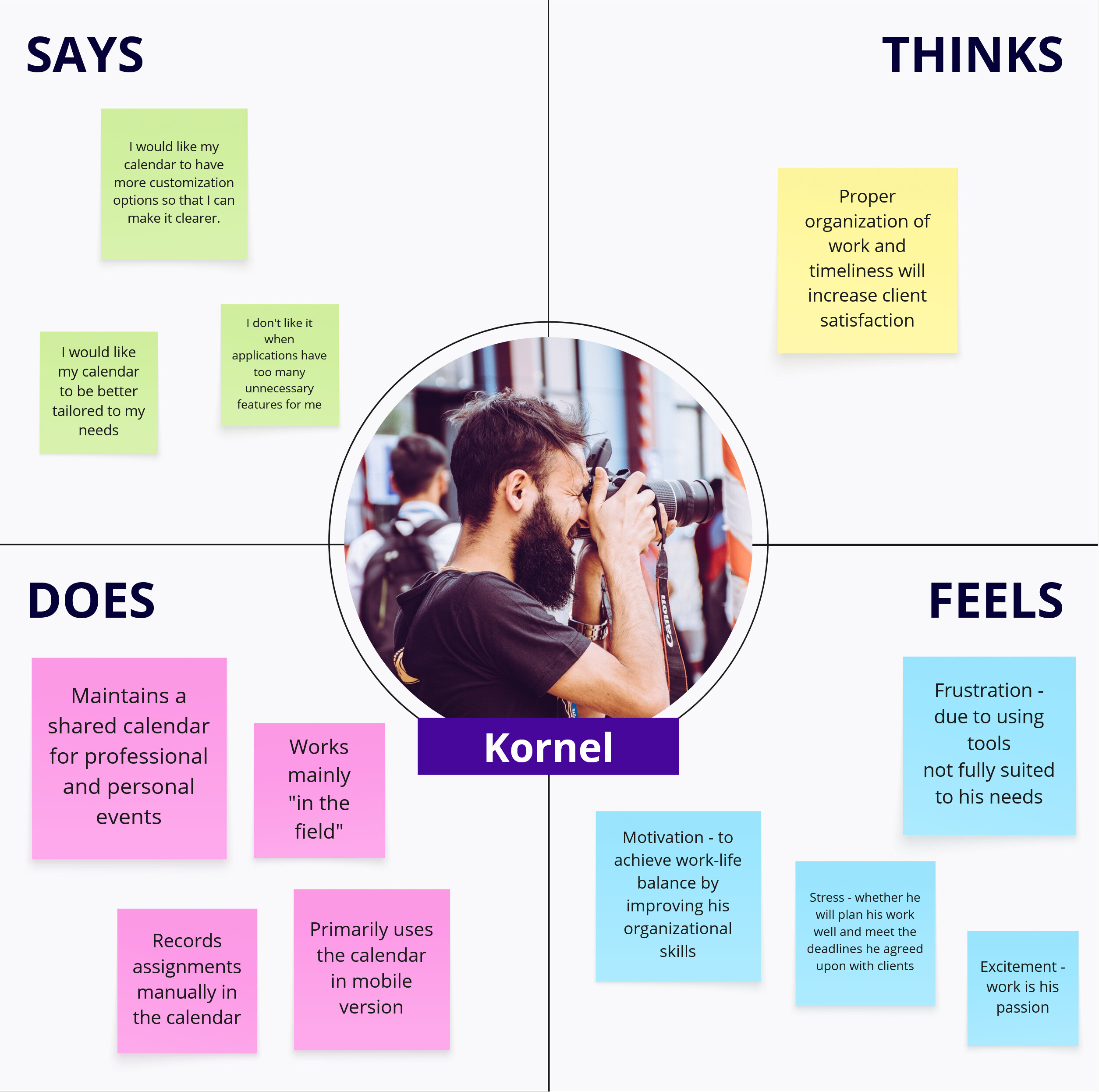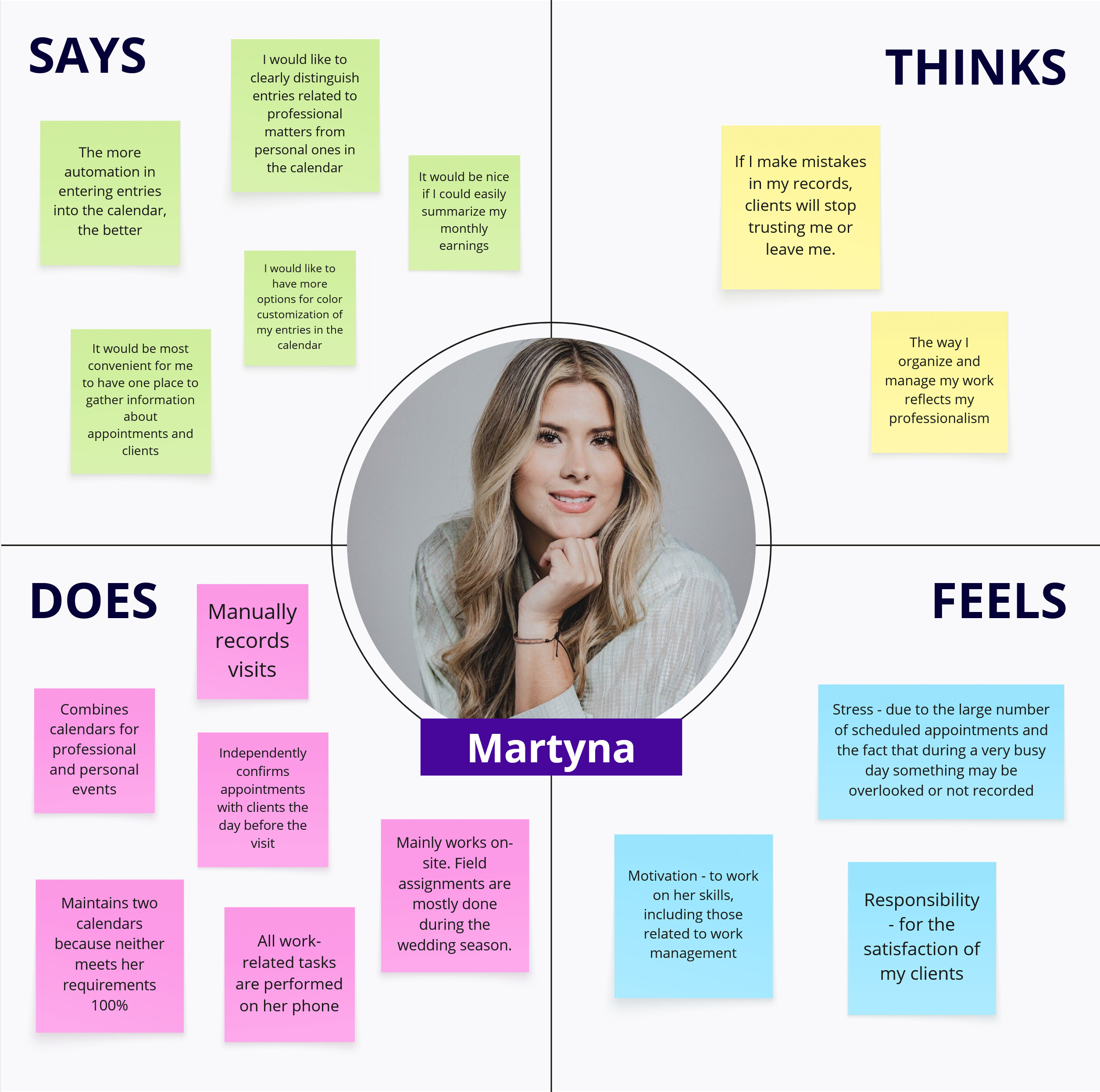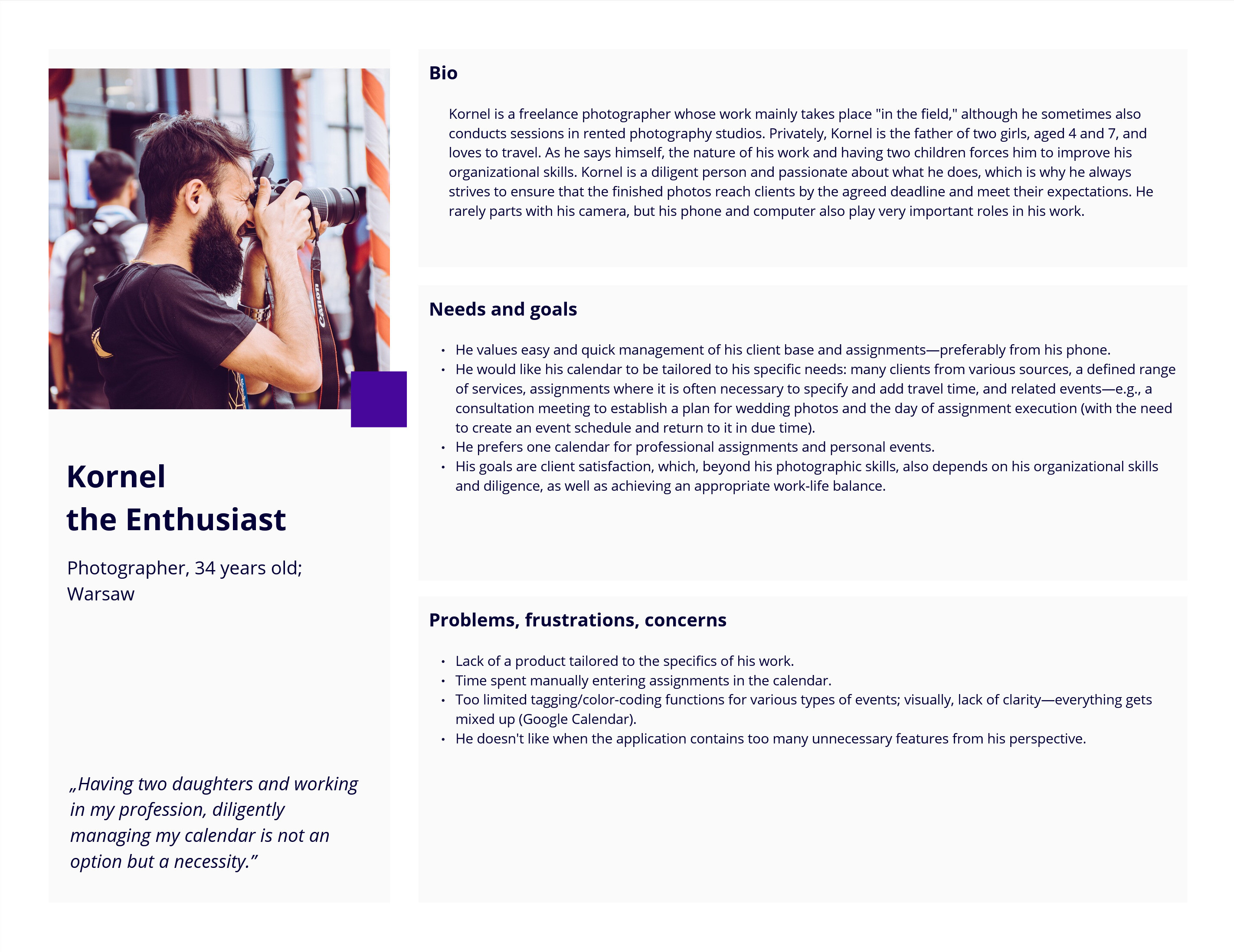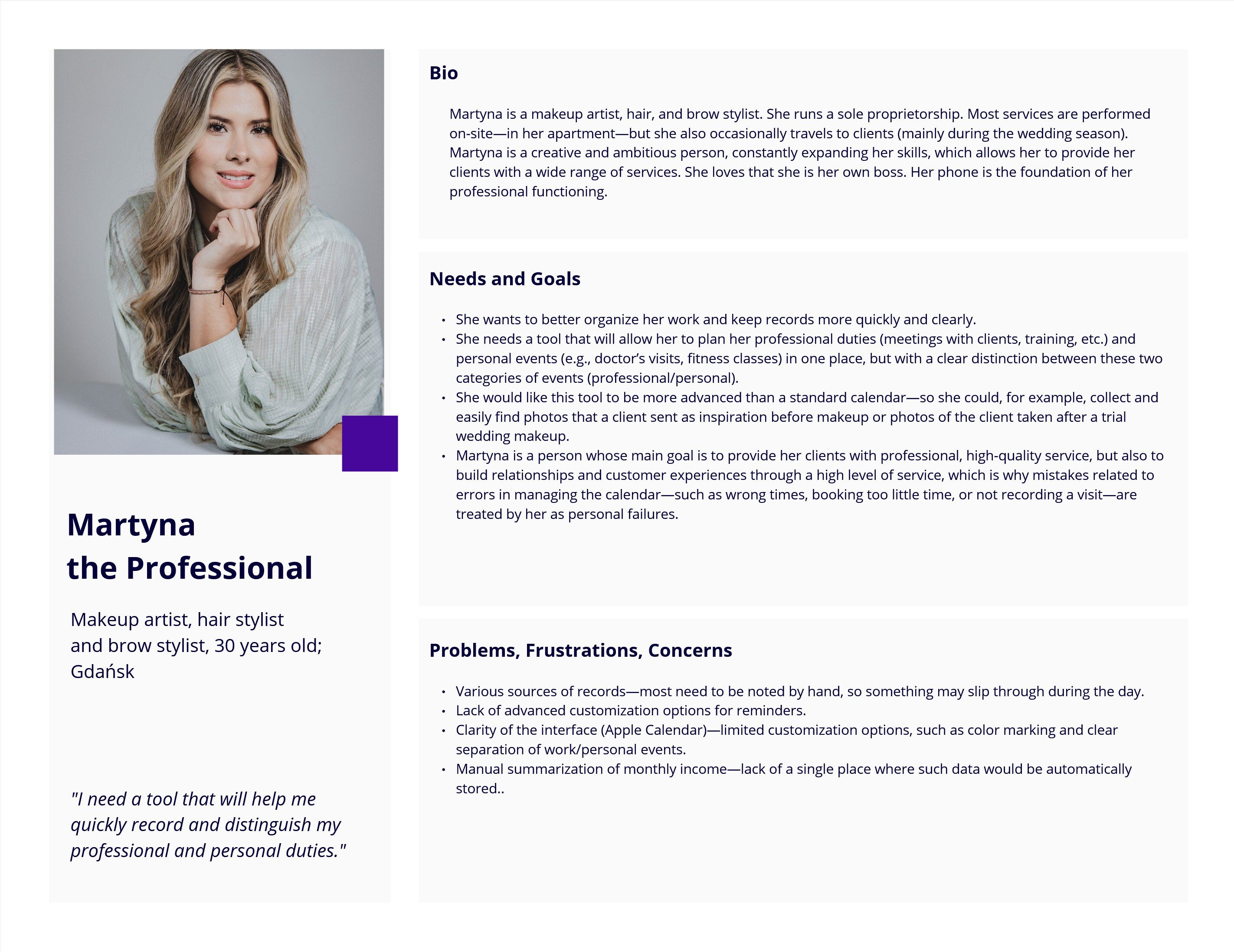 To better understand user needs, goals, and expected outcomes, I created three User Stories based on the prioritized product functionalities. They cover: creating a calendar entry, configuring a new service, and adding attachments to a customer profile.