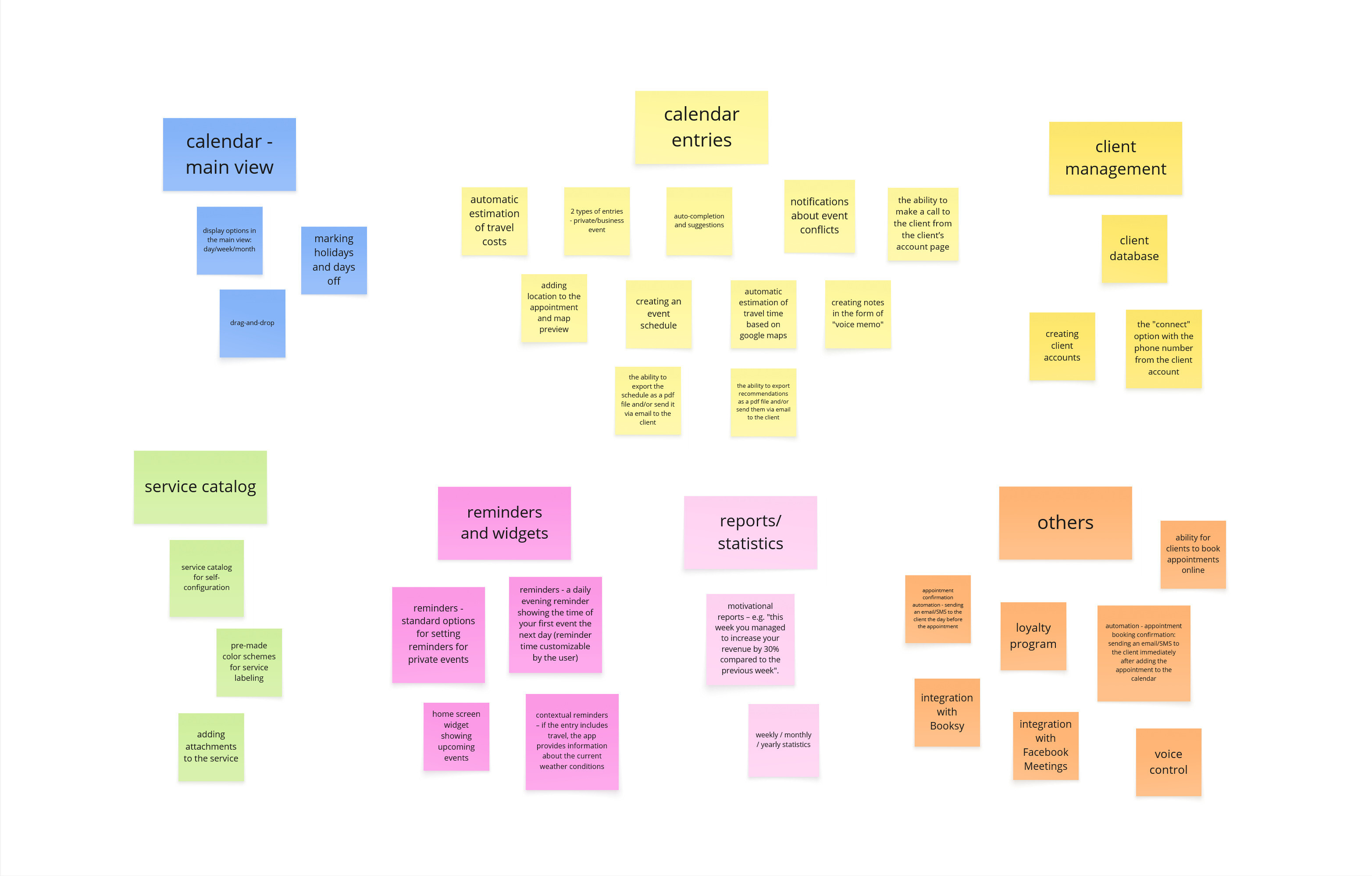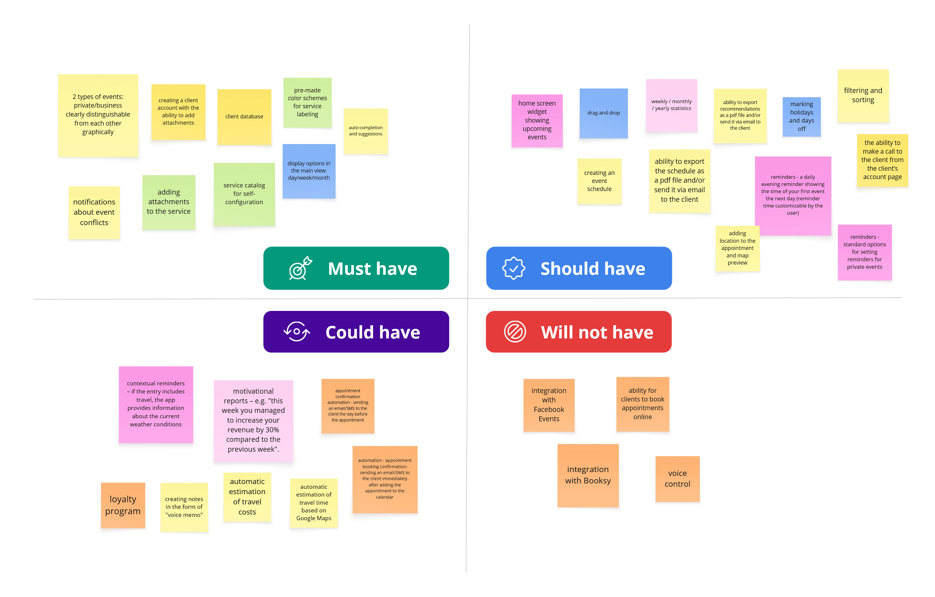 After generating ideas, I grouped them into seven categories. Then, to identify the key functionalities for the project, I applied the MoSCoW prioritization method.
