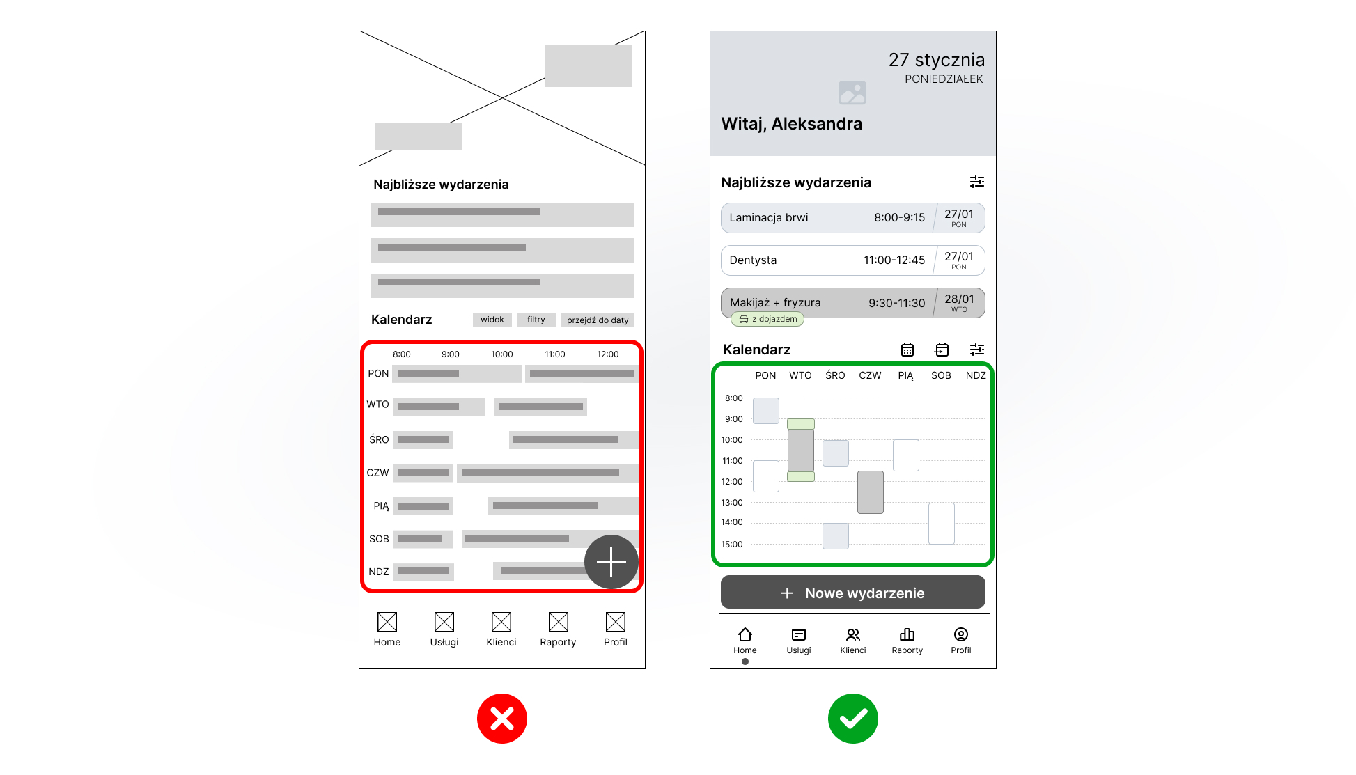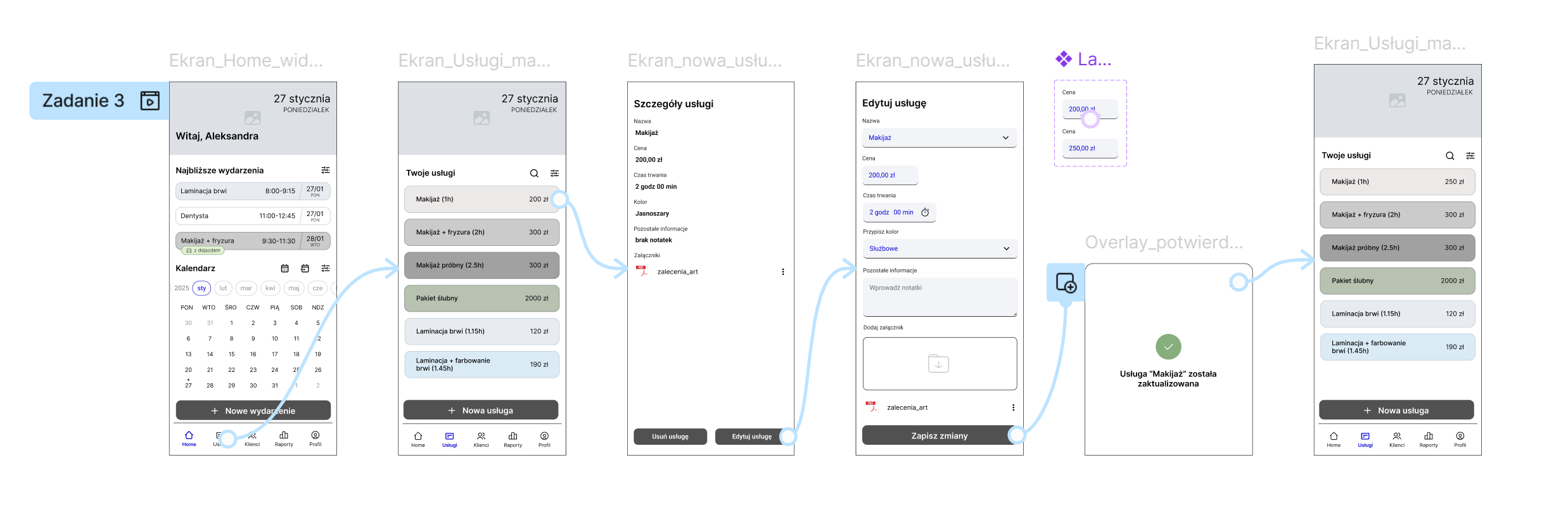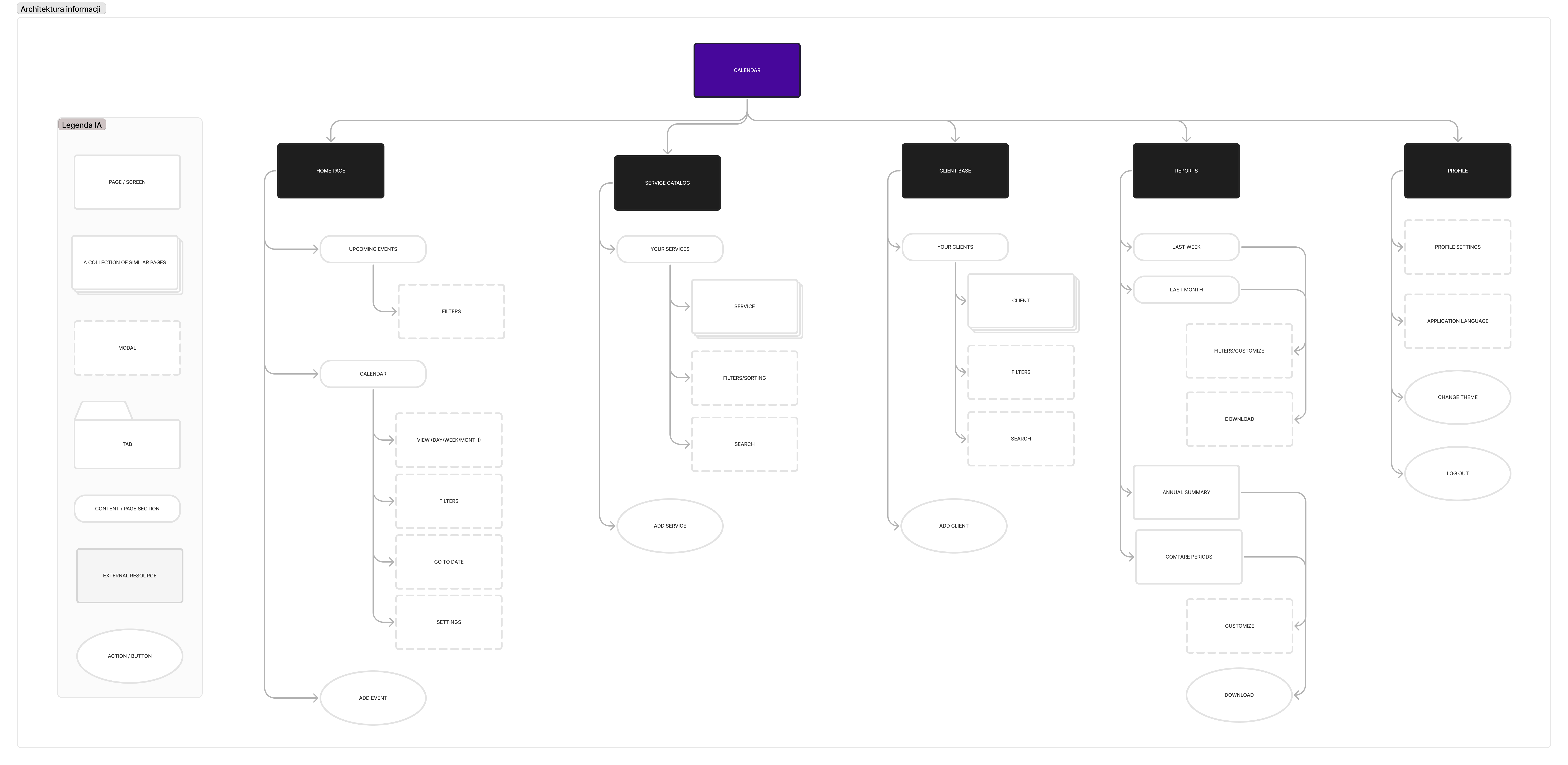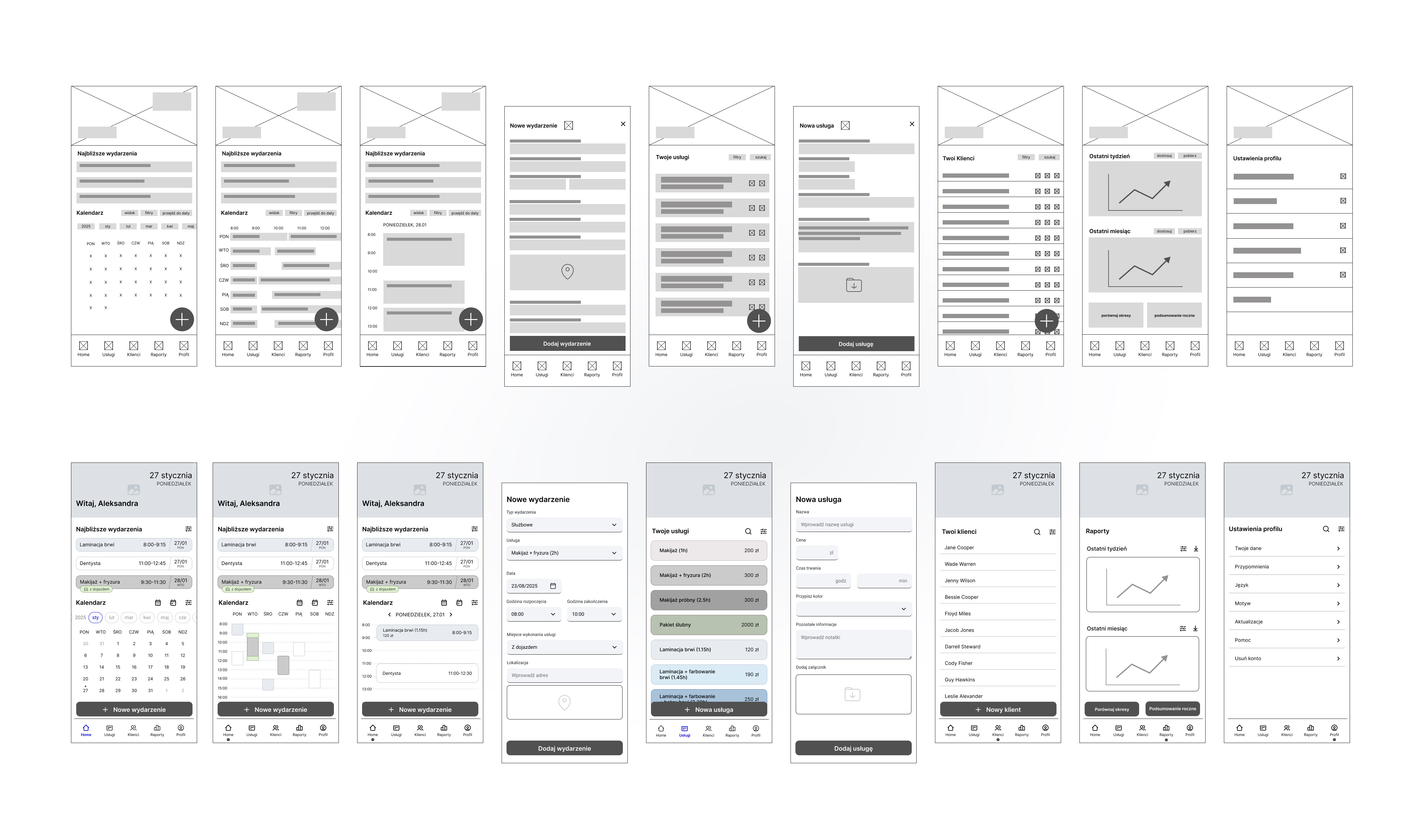 The design process began with low-fidelity sketches, initially created on paper and then transferred to Figma. I designed nine screens: the dashboard (in three calendar view variations), the service panel, clients, reports, and user profile, as well as screens for adding a new event and a new service.