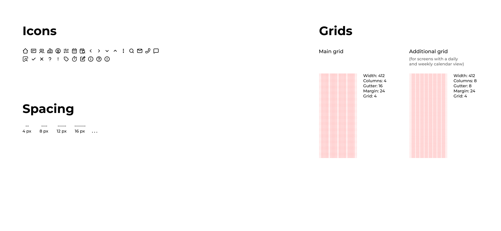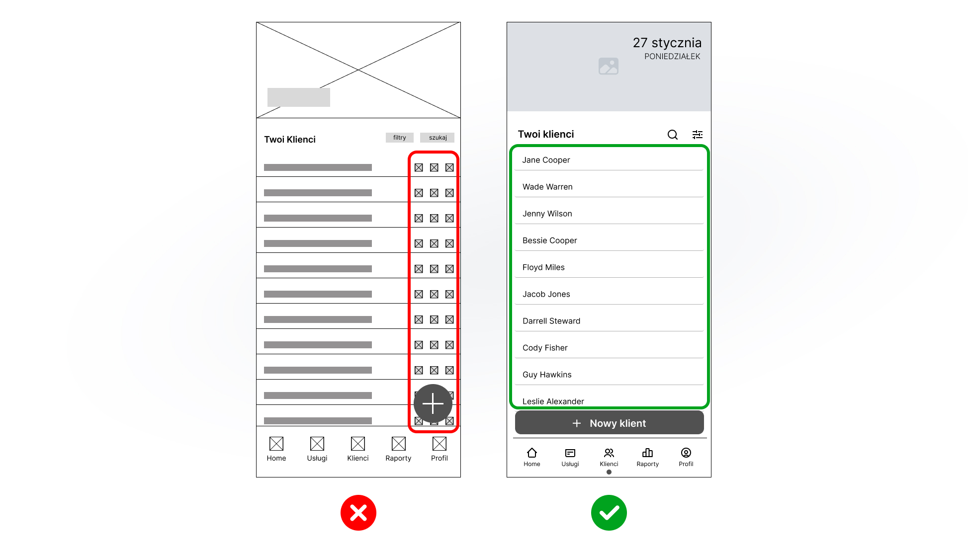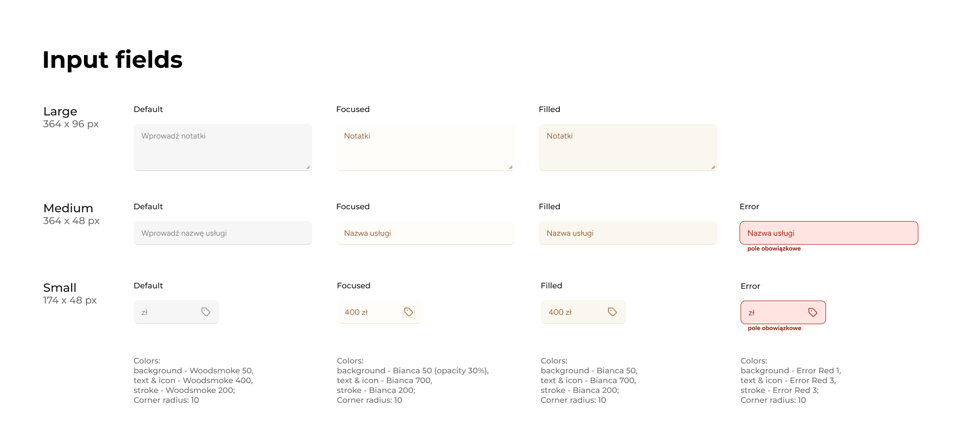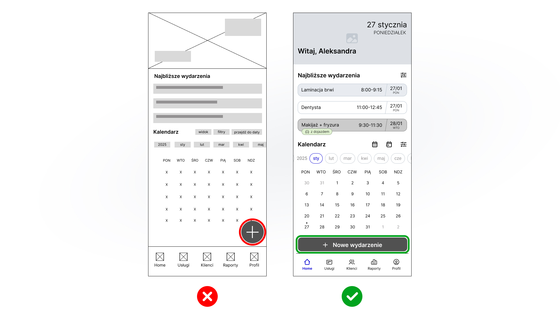 The design process began with low-fidelity sketches, initially created on paper and then transferred to Figma. I designed nine screens: the dashboard (in three calendar view variations), the service panel, clients, reports, and user profile, as well as screens for adding a new event and a new service.