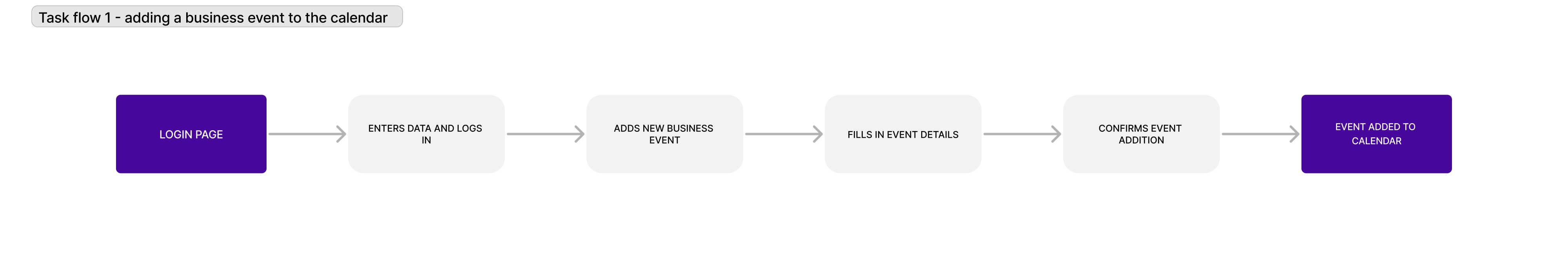 To support this stage, I created task flow and user flow diagrams for the following features: creating a calendar entry, configuring a new service, and adding attachments to a client profile. These diagrams illustrate the steps and interactions users take while completing key tasks. Examples are shown below: